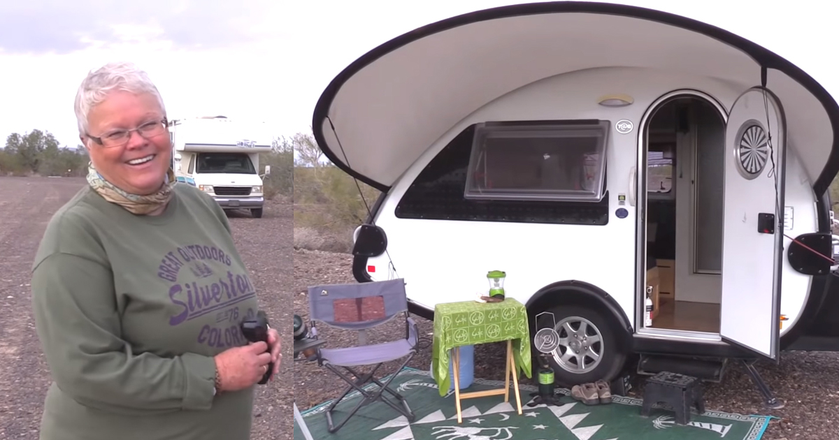 Den glade pensjonisten kjøpte seg også en Jeep Wrangler til å dra campingvognen hennes. Vognen veier bare 770 kilo, så den er lett å dra.